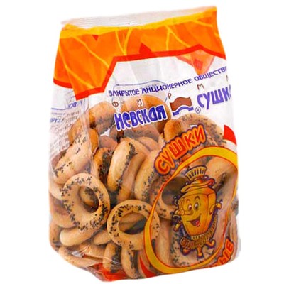 Сушки с добавлением мака расфасованы в пакеты по 275 грамм. Пищевая ценность в 100г: жира 5,0г, белка 12г, углеводов 75г. Энергетическая ценность на 100 гр. продукта: 390 ккал. Срок годности: 180 дней. Условия хранения: Хранить при Т не выше 25’C и относительной влажности воздуха не более 65- 75%. Производитель: Невская сушка. Страна производства: Россия. Постный продукт.