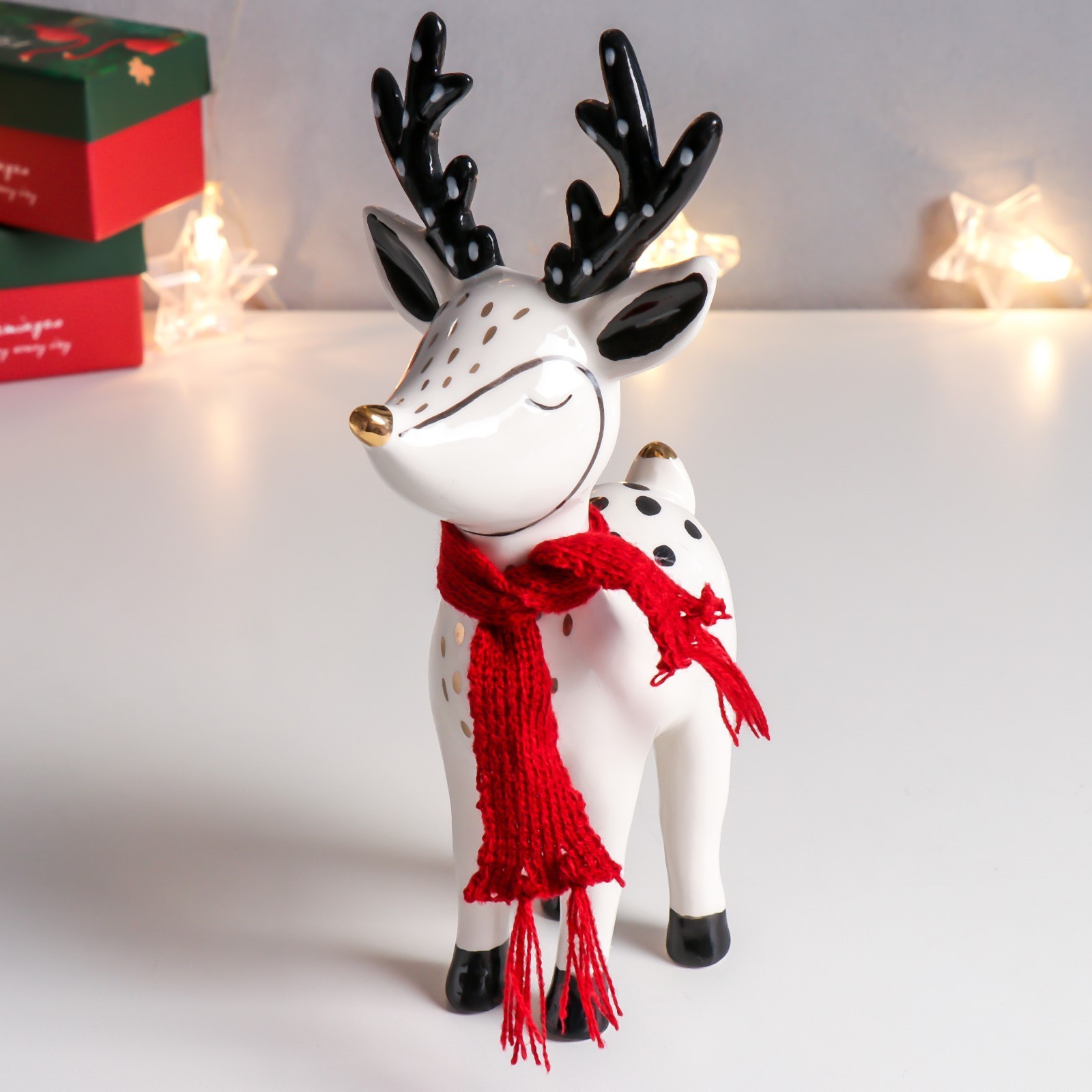 Сувенир керамика "Олень в шарфике" белый с чёрными рогами арт.7405567