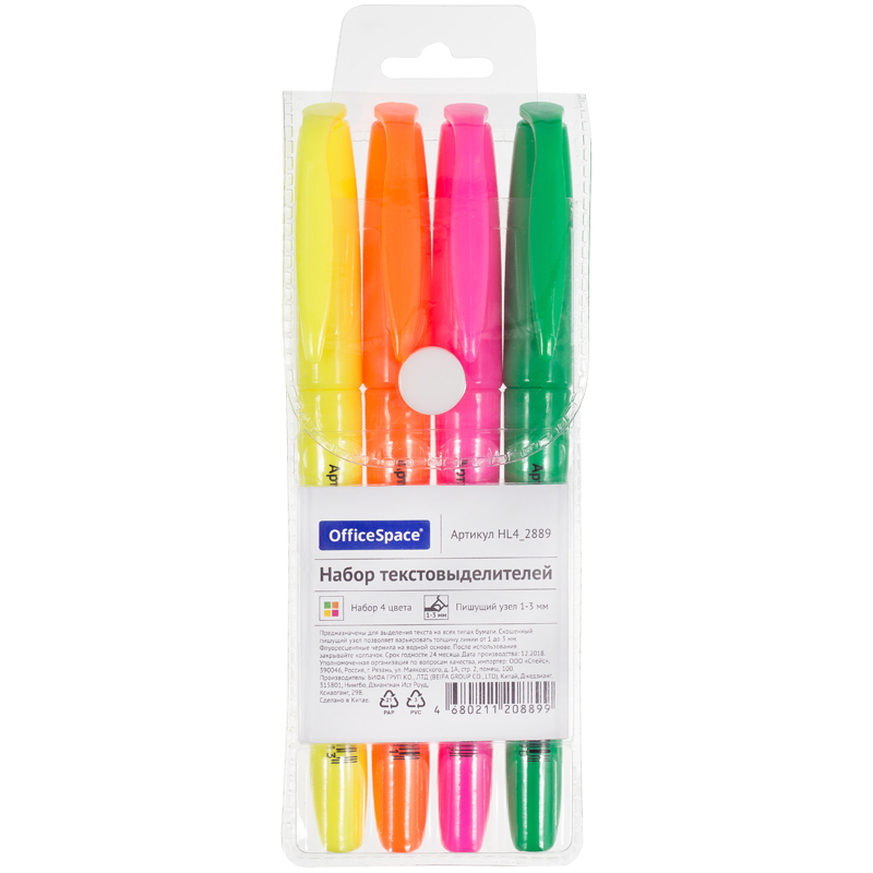 Текстовыделитель "OfficeSpace" 4 шт/набор 1-3 мм. скошенный арт.HL4_2889