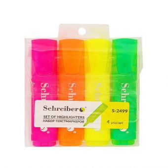 4 штуки текстовыделителей упакованы в прозрачный ПВХ чехол.