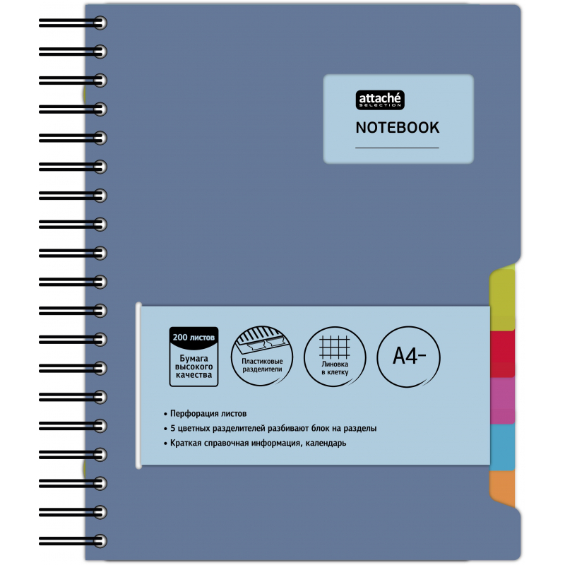 Бизнес-тетрадь Attache Selection Office Book формата А4- строгого классического дизайна, обложка выполнена из плотного метализированного пластика, защищает бумагу от деформации. Цвет: синий металлик. Блок: скрепленный по вертикальному краю толстой черной спиралью, состоит из 200 листов с микроперфорацией для аккуратной линии отрыва. Размер блока - 173x245 мм. Бумага высокой степени белизны разлинована в клетку, с полями . 5 съемных пластиковых разделителей разбивают блок на тематические разделы, что очень удобно для ведения записей по нескольким предметам.