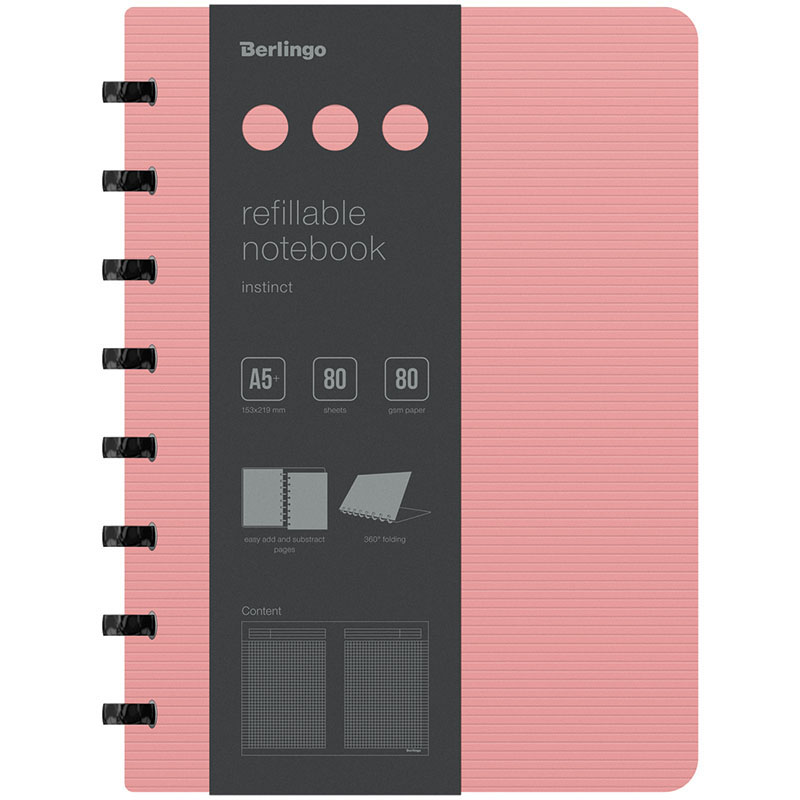 Бизнес-тетрадь Berlingo "Instinct" - это практичное, стильное и современное изделие для планирования и записей. Такая бизнес-тетрадь является незаменимым инструментом для деловых людей. Увеличенная толщина обложки (1500мкм). Формат А5+. Насыщенный пастельный розовый цвет внешней стороны в сочетании с фактурой "горизонтальные линии". Черный цвет внутренней поверхности. Материал обложки - трехслойный пластик (полифом), надежно защищает внутренний блок от влаги, замятия и загрязнения, обложка устойчива к загрязнениям. Вид скрепления – стильные имиджевые черные кольца, с возможностью раскрывать тетрадь на 360⁰. Возможна замена бумажного блока и быстрая и удобная выемка/вставка листов без повреждений. Бизнес-тетрадь содержит съемную брендированную линейку, которую можно использовать как закладку или разделитель и с легкостью можно перемещать в удобное место. Внутренний блок – высококачественная тонированная бумага, плотностью 80г/м2, 80 листов в клетку, рамка для заголовка, темы или даты, поля с обеих сторон блока на каждом листе, линовка на вылет. Размер бизнес-тетради 220*160мм, диаметр колец 22мм.