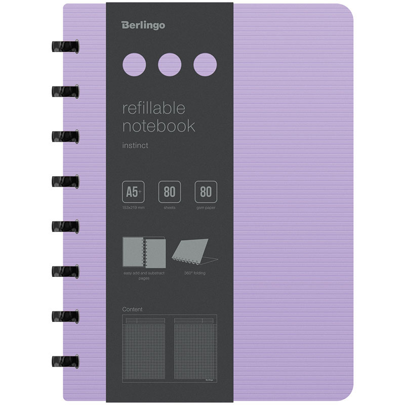 Бизнес-тетрадь Berlingo "Instinct" - это практичное, стильное и современное изделие для планирования и записей. Такая бизнес-тетрадь является незаменимым инструментом для деловых людей. Увеличенная толщина обложки (1500мкм). Формат А5+. Насыщенный пастельный фиолетовый цвет внешней стороны в сочетании с фактурой "горизонтальные линии". Черный цвет внутренней поверхности. Материал обложки - трехслойный пластик (полифом), надежно защищает внутренний блок от влаги, замятия и загрязнения, обложка устойчива к загрязнениям. Вид скрепления – стильные имиджевые черные кольца, с возможностью раскрывать тетрадь на 360⁰. Возможна замена бумажного блока и быстрая и удобная выемка/вставка листов без повреждений. Бизнес-тетрадь содержит съемную брендированную линейку, которую можно использовать как закладку или разделитель и с легкостью можно перемещать в удобное место. Внутренний блок – высококачественная тонированная бумага, плотностью 80г/м2, 80 листов в клетку, рамка для заголовка, темы или даты, поля с обеих сторон блока на каждом листе, линовка на вылет. Размер бизнес-тетради 220*160мм, диаметр колец 22мм.