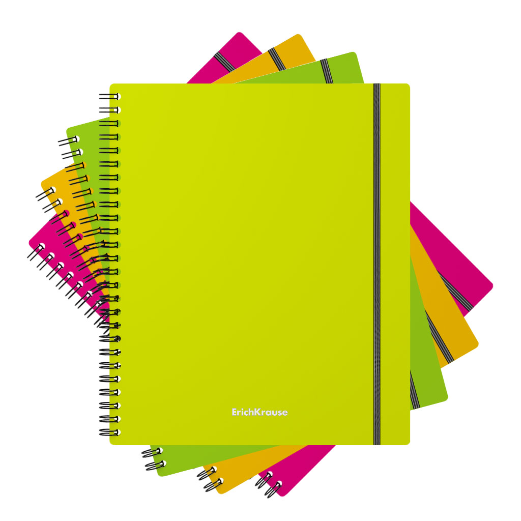 Тетрадь общая формата А5+ (170х205 мм). Обложка из высококачественного износостойкого матового пластика с фактурой «песок». Яркие неоновые цвета обложки. В блоке 80 листов в клетку. Бумага офсетная плотностью 55 г/м2. Цвет линовки - синий. Скругленные уголки обложки. Обложка фиксируется прочной эластичной резинкой. Тип скрепления - спираль. Тетради одного цвета упакованы в термоусадочную пленку по 4 штуки. Товар поставляется в нескольких вариантах цвета без возможности выбора.