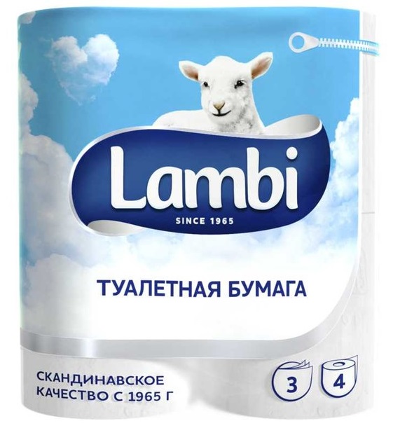 Туалетная бумага "LAMBI" 3-х слойная бел.с цв/тисн.4рул./уп. 399104/15640