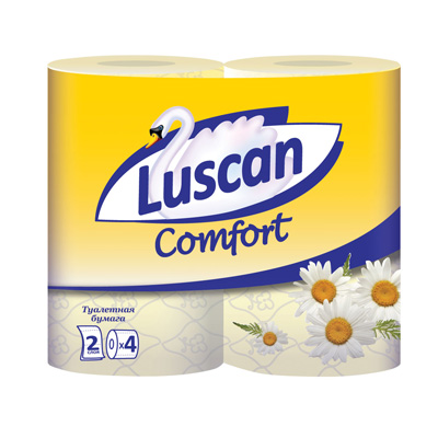 Двухслойная туалетная бумага Luscan Comfort желтого цвета имеет тиснение и аромат ромашки. Длина намотки в рулоне — 21,88 метра, полотно разделено перфорацией на 175 листов. Бумага туалетная 2-сл изготовлена из облагороженной макулатуры. Упаковка содержит четыре рулона. Туалетная бумага бытовая отличается мягкостью и прочностью, хорошо растворяется в воде.