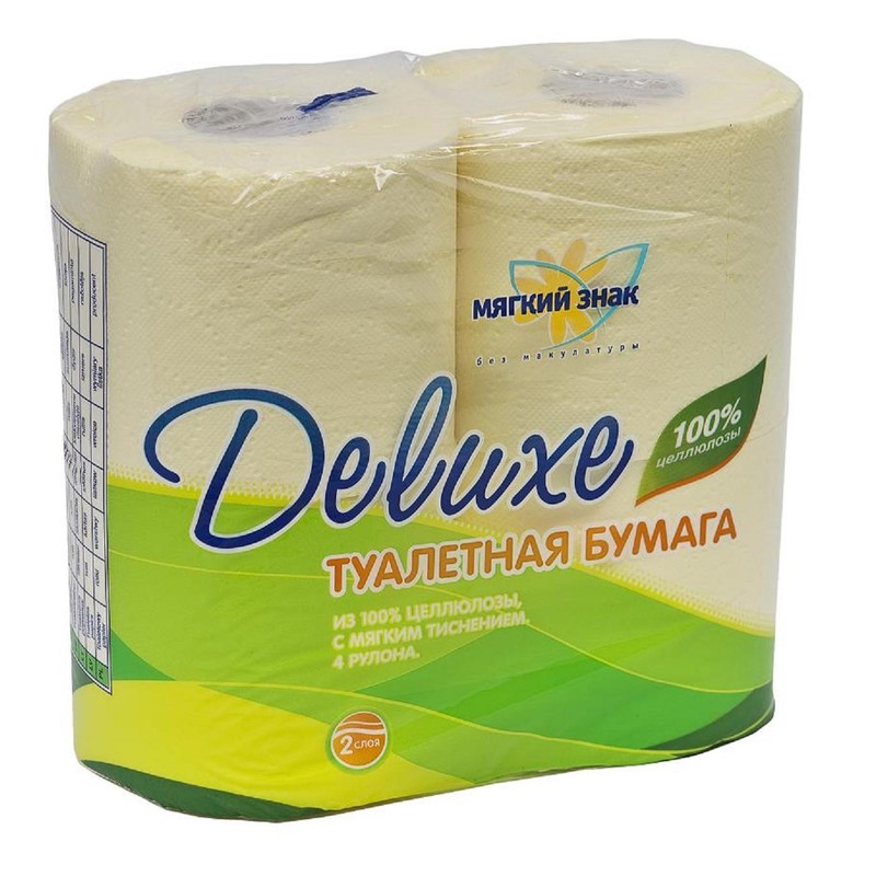 Двухслойная туалетная бумага «Мягкий знак» Deluxe желтого цвета имеет тиснение. Изготовлена по уникальной технологии склейки слоев по рисунку. Длина намотки в рулоне — 21,88 метра, бумажное полотно разделено перфорацией на 175 листов. Упаковка содержит четыре рулона. Туалетная бумага отличается мягкостью, изготовлена из стопроцентной целлюлозы.