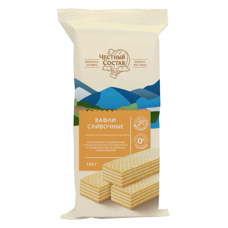 Яркий вкус и аромат сливок в хрустящем вафельном корпусе. Сделаны на кокосовом масле и по всем правилам: ГОСТ, без пальмового масла и трансжиров. Состав: сахар, масло кокосовое рафинированное дезодорированное отбеленное, вафли (мука пшеничная 1 сорт, разрыхлитель натрий двууглекислый, масло подсолнечное рафинированное дезодорированное вымороженное, соль пищевая, эмульгатор лецитин соевый, регулятор кислотности: кислота лимонная), молоко цельное сухое, сыворотка молочная сухая, сливки сухие (молоко обезжиренное, сливки), эмульгатор лецитин соевый, натуральный ароматизатор. Пищевая ценность: белки - 6,5 г, жиры - 32 г, углеводы - 61 г. Энергетическая ценность: 2340 кДж, 560 ккал. Хранить при температуре 18+3 °С и относительной влажности воздуха не более 75%. Масса нетто: 150 г. Страна производства: Россия.