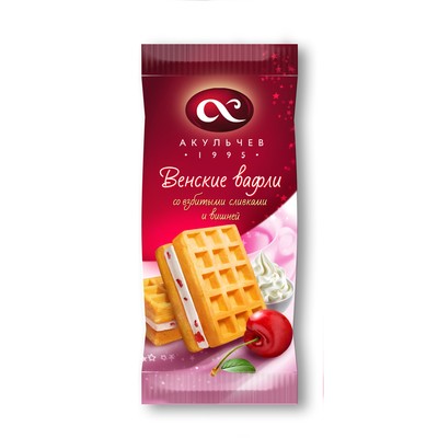 Сэндвич из двух прямоугольных мягких вафель с прослойкой из взбитых сливок с кусочками вишни. Насыщенный аромат ягод окутан нежным облаком сливочного вкуса.