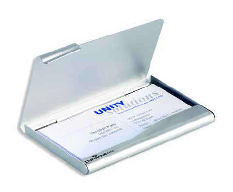 Карманная визитница Durable изготовлена из мягкого алюминия и рассчитана на 20 стандартных визиток или банковских карточек. Она надежна и долговечна, станет отличным аксессуаром или корпоративным сувениром. Внутренние карманы выполнены из прозрачного полипропилена, который позволяет прочесть информацию на карточке с обеих сторон. Максимальный размер карточек и банковских карт — 90×55 мм.