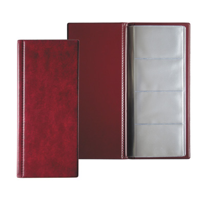 Настольная визитница позволяет удобно и надежно хранить визитные карточки. Изготовлена из качественного ПВХ бордового цвета. Внутри расположены вкладыши с карманами на 96 визиток. Прозрачный материал карманов с антибликовой поверхностью позволяет читать информацию, не вынимая карточки. Размеры визитницы — 11×25×1 см.