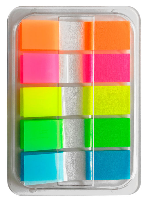 Закладки пластиковые Lamark уложены в диспенсере по Z-принципу. Легко извлекаются и строго по одной. В диспенсере пять цветов неон по 20 листов. Размер закладки 44х12 мм. Уникальный адгезивный состав позволяет наносить этикетку на любую поверхность многократно. Не оставляет следов. На закладке можно делать надписи как ручкой, так и карандашом.