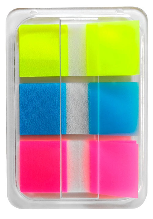 Закладки пластиковые Lamark уложены в диспенсере по Z-принципу. Легко  извлекаются и строго по одной. В диспенсере три цвета неон  по 20 листов. Размер закладки 44х20 мм. Уникальный адгезивный состав позволяет наносить этикетку на любую поверхность многократно. Не оставляет следов. На закладке можно делать надписи как ручкой, так и карандашом.