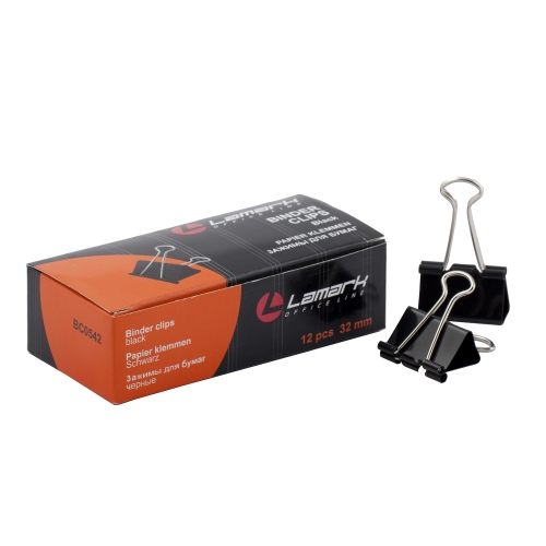 Артикул:BC0542, Название:Зажимы для бумаг черные 32мм 12шт, Торговая марка:Lamark, Страна:Германия, Упаковка:12/300