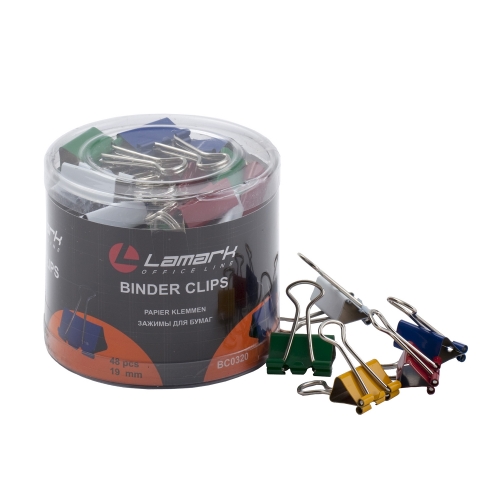 Артикул:BC0320, Название:Зажимы для бумаг цветные 19мм 48шт/банка, Торговая марка:Lamark, Страна:Германия, Упаковка:12/144