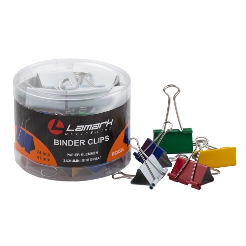 Артикул:BC0326, Название:Зажимы для бумаг цветные 41мм 24шт/банка, Торговая марка:Lamark, Страна:Германия, Упаковка:12/24