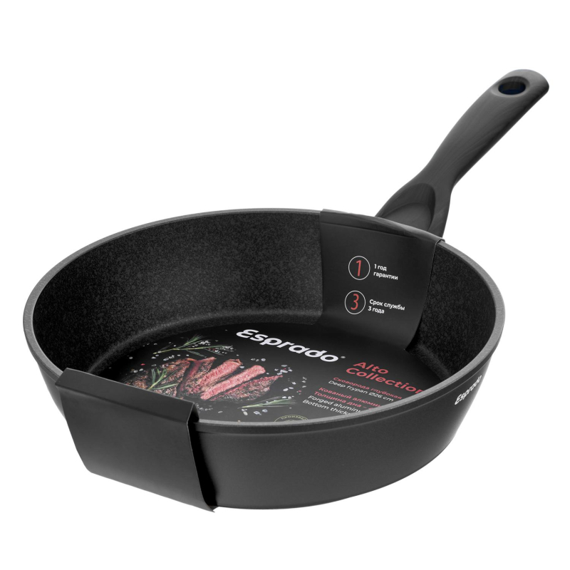 Сковорода Esprado Alto - коллекция глубоких сковород из кованого алюминия с оригинальным оформлением под натуральные материалы (дерево, гранит). Благодаря высокому борту и большой рабочей поверхности, сковороды универсальны и отлично подойдут для жарки, тушения и приготовления блюд с большим количеством ингредиентов. Долговечное покрытие ILAG Basic, разработанное в Швейцарии, гарантирует отличные антипригарные свойства сковород. Не нагревающаяся ручка с покрытием soft-touch обеспечивает удобство и безопасность использования. Сковороды коллекции Alto можно мыть в посудомоечной машине и использовать на всех типах плит, включая индукционные.