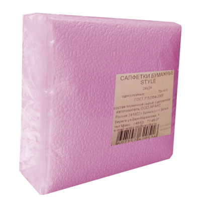 Однослойные сервировочные салфетки «Пастель» изготовлены из бумаги пастельно-розового цвета с тиснением. Сложены вчетверо, размер — 24×24 см. Поставляются по 75 штук в полиэтиленовой упаковке. Материал — 100% целлюлоза.