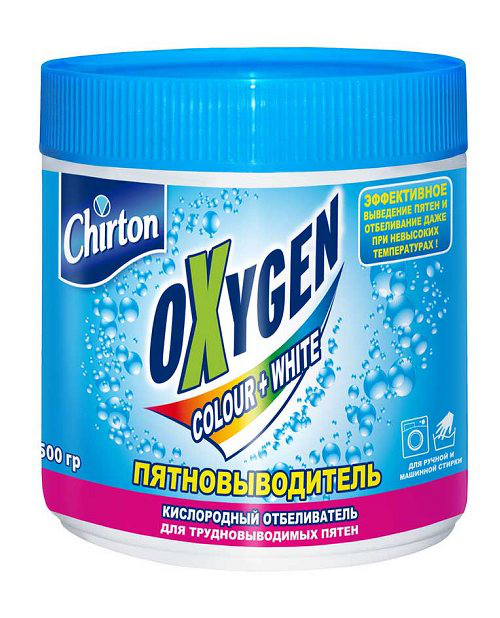 Мощный кислородный отбеливатель-пятновыводитель Chirton Oxygen удаляет даже самую сильную и застарелую грязь с любой одежды и любых изделий из тканей (скатертей, штор, покрывал, синтетических ковров и т.д.). Отбеливатель-пятновыводитель Chirton Oxygen может применяться как для выведения отдельных пятен, так и при любой стирке. Благодаря специальному составу, Chirton Oxygen эффективно проникает между волокнами ткани и устраняет самые трудно-выводимые пятна, не нарушая при этом структуру ткани. Отбеливатель-пятновыводитель Chirton Oxygen не содержит хлора, поэтому его применение возможно для любых, в том числе самых деликатных тканей. Мерная ложка в комплекте отбеливателя-пятновыводителя Chirton Oxygen делает его использование очень простым и удобным.