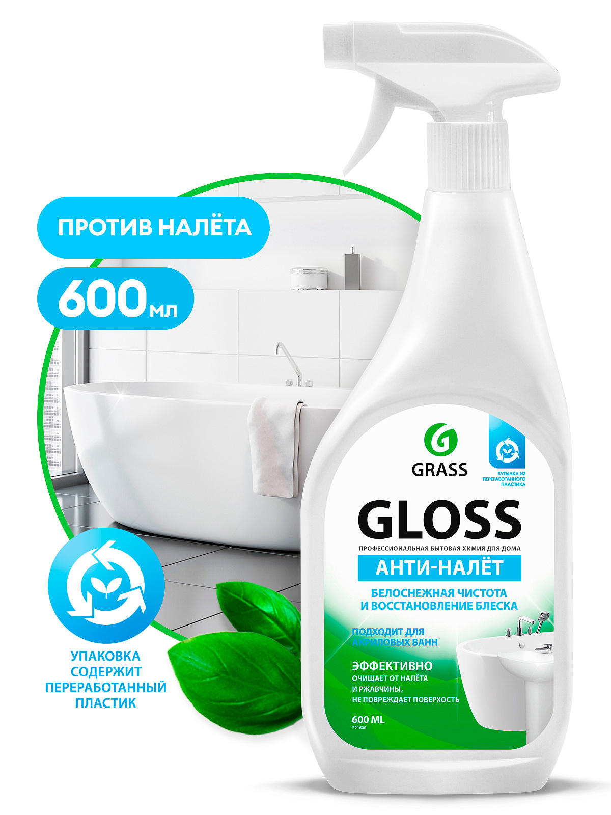 Профессиональное чистящее средство Grass Gloss 600 мл. Назначение: Универсальное моющее средство на основе лимонной кислоты для ванной комнаты и кухни. Подходит для чистки ванны, душевой кабины, унитаза, фаянсовых изделий, кафеля, сантехники, от известкового налета, подтеков ржавчины, мыльных разводов и солевых отложений. Рекомендовано для акриловых ванн. Способ применения: Применение нанести на очищаемую поверхность, оставить на несколько минут. Потереть губкой или щеткой, смыть водой. При необходимости обработку повторить. Средство может использоваться при температуре от 0 °С до 40 °С. Перед первым применением убедитесь (в незаметном месте), что средство не повреждает очищаемую поверхность. Меры предосторожности: Работу по средствам осуществлять в перчатках. При попадании в глаза промыть большим количеством воды и обратиться к врачу. Условия хранения: Храните в плотно закрытой упаковке в местах, недопустимых для детей. Состав: Вода, лимонная кислота, неионогенные ПАВ, d-лимонен, акриловый сополимер, ароматизирующий компонент. Продукция не содержит фосфаты, а также является биоразлагаемой более 90 %. Срок хранения: 18 месяцев.