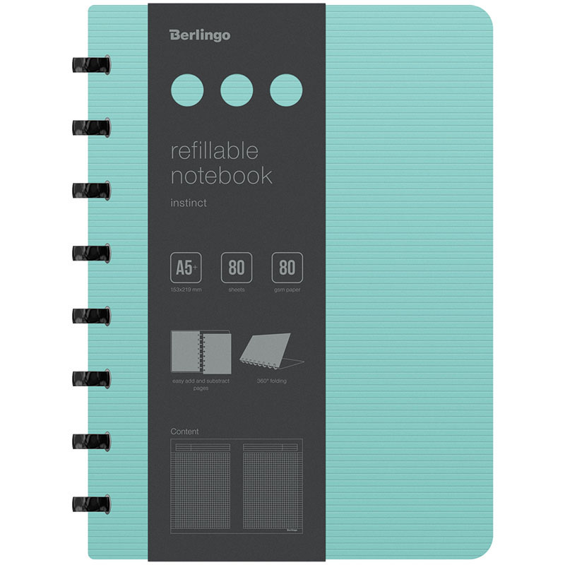 Бизнес-тетрадь Berlingo "Instinct" - это практичное, стильное и современное изделие для планирования и записей. Такая бизнес-тетрадь является незаменимым инструментом для деловых людей. Увеличенная толщина обложки (1500мкм). Формат А5+. Насыщенный пастельный мятный цвет внешней стороны в сочетании с фактурой "горизонтальные линии". Черный цвет внутренней поверхности. Материал обложки - трехслойный пластик (полифом), надежно защищает внутренний блок от влаги, замятия и загрязнения, обложка устойчива к загрязнениям. Вид скрепления – стильные имиджевые черные кольца, с возможностью раскрывать тетрадь на 360⁰. Возможна замена бумажного блока и быстрая и удобная выемка/вставка листов без повреждений. Бизнес-тетрадь содержит съемную брендированную линейку, которую можно использовать как закладку или разделитель и с легкостью можно перемещать в удобное место. Внутренний блок – высококачественная тонированная бумага, плотностью 80г/м2, 80 листов в клетку, рамка для заголовка, темы или даты, поля с обеих сторон блока на каждом листе, линовка на вылет. Размер бизнес-тетради 220*160мм, диаметр колец 22мм.