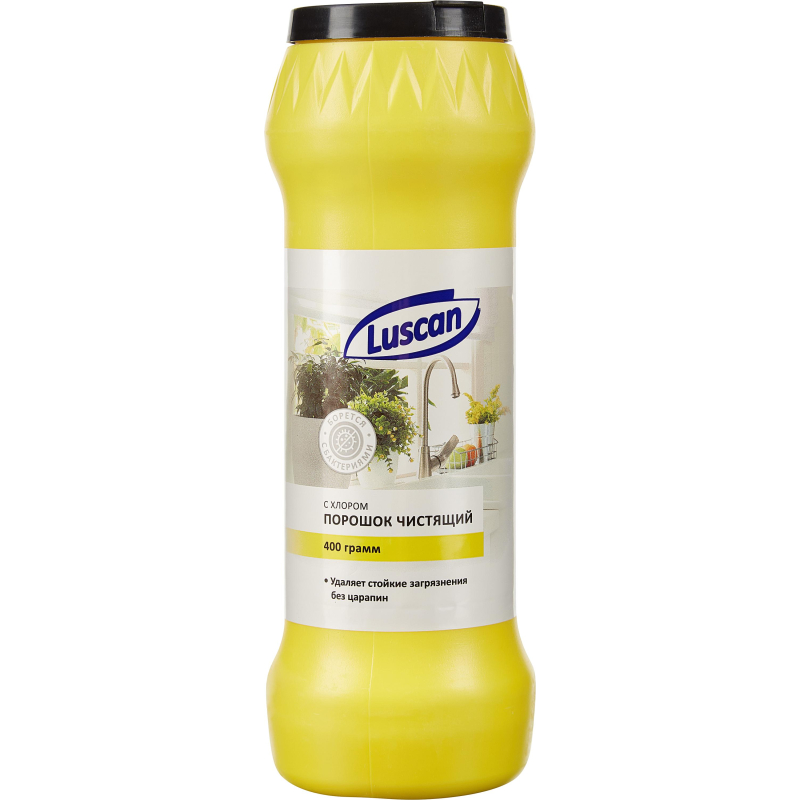 Универсальное чистящее средство Luscan порошок 400 г Назначение. Средство предназначено для чистки плит (в том числе стеклокерамических), ванн, раковин, унитаза, кафеля. Способ применения. Нанесите средство непосредственно на очищаемую поверхность или на влажную губку. Потрите поверхность губкой и смойте водой. При наличии стойких загрязнений оставьте средство на 5-10 минут. Меры предосторожности. ОСТОРОЖНО! Содержит хлор! Хранить в недоступном для детей месте! При использовании применять резиновые перчатки. При попадании в глаза промыть большим количеством воды в течение 15-20 минут. При случайном проглатывании - прополоскать рот водой. При необходимости обратиться к врачу. Состав. Карбонат кальция (30% и более), карбонат натрия (менее 5%), анионный ПАВ (менее 5%), гипохлорит кальция (менее 5%), триполифосфат натрия (менее 5%), ароматизирующая примесь (менее 5%). Условия хранения. Хранить в сухом месте. Температурный режим хранения не ограничен. Срок годности. 12 месяцев.