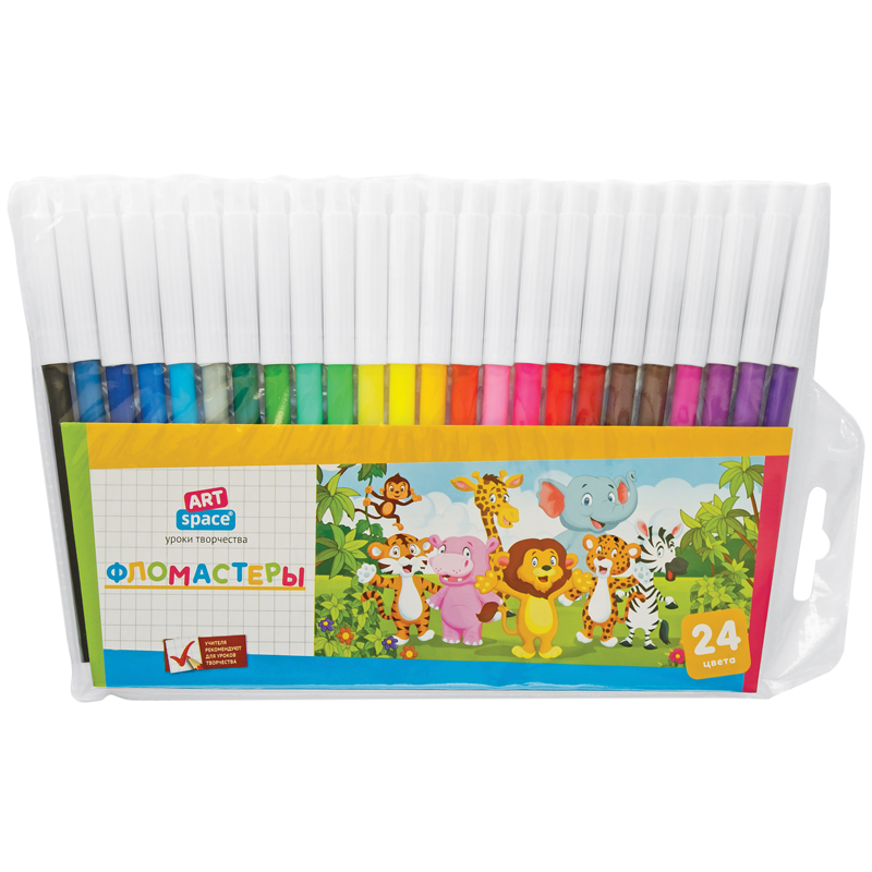 Фломастеры ArtSpace серии «Веселые зверята» представлены с несмываемыми чернилами и невентилируемым колпачком.Толщина линии составляет 1 мм. В наборе 24 цвета. Корпус круглой формы изготовлен из полипропилена и имеет удобную круглую зону захвата. Тип наконечника – конический. Несмываемые фломастеры на водной основе нетоксичны. Набор фломастеров упакован в ПВХ-чехол с европодвесом.
