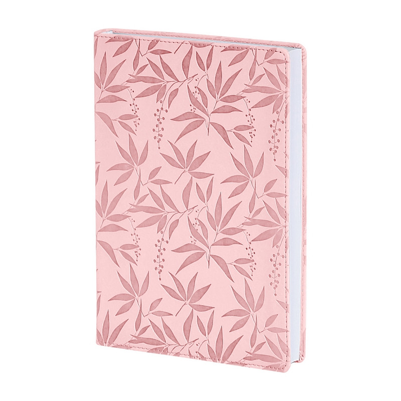 Ежедневник недатированный Infolio из коллекции Leaves А5 формата (140х200 мм) в розовом цвете и с тиснением свежих листочков, которые создают весеннее настроение. Мягкая обложка из матовой гладкой искусственной кожи с декоративным тиснением и прострочкой по периметру имеет скругленные уголки. Недатированный внутренний блок в линейку на 160 листов (320 страниц) - из высококачественной белой бумаги плотностью 70 г/кв.м с прямыми уголками. В ежедневнике имеется информационный блок, содержащий разделы: личные данные, карты мира и России, российские праздники, разница во времени между Москвой и городами России, международные единицы мер, планирование задач, важные даты. В ежедневнике также имеется одна удобная атласная закладка.