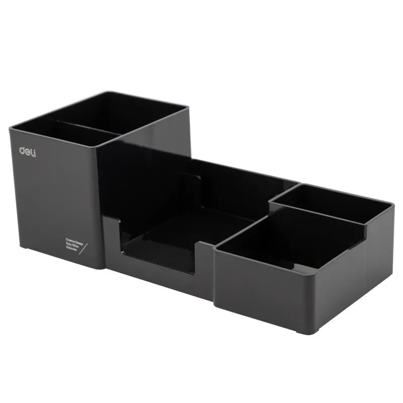 Подставка Deli для пишущих принадлежностей. Настольный органайзер для хранения вещей отлично подойдет для хранения мелочей на вашем на столе. Многофункциональная подставка под канцелярские принадлежности станет настоящим украшением любого интерьера! Ненавязчивость форм, соответствующий дизайн, утонченность материалов. Функциональный и стильный органайзер для ручек, ножниц, линеек, карандашей, изготовлен из высококачественного полистирола. Подставка под школьные принадлежности для рабочего стола имеет стильный дизайн, вместительные отсеки. Всего шесть блоков: два глубоких отделения для хранения карандашей, ручек, фломастеров, маркеров, и четыре для хранения стикеров , клея, скотч, скрепки и других вещей. На дне изделия располагается противоскользящее покрытие, препятствующее скольжению и удержанию подставки. Большое количество отделений позволяют использовать канцелярскую подставку как органайзер для косметики. Будет идеальным подарком для школьника, ребенка или подростка. Размер подставки: 254х112х90мм Цвет: черный