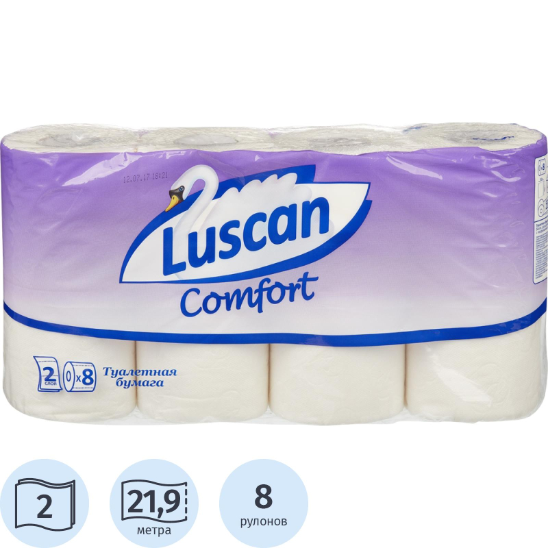 Бумага туалетная Luscan Comfort 2-слойная белая (8 рулонов в упаковке). Назначение: двухслойная туалетная бумага Luscan Comfort белого цвета с тиснением и перфорацией - это отличное сочетание прочности и мягкости. Бумага не расслаивается и отрывается строго по линии перфорации. Тиснение способствует лучшей впитываемости, а перфорация позволяет использовать бумагу более экономно.Изготовлена из 100% целлюлозы. Поставляется упаковками по 8 рулонов.